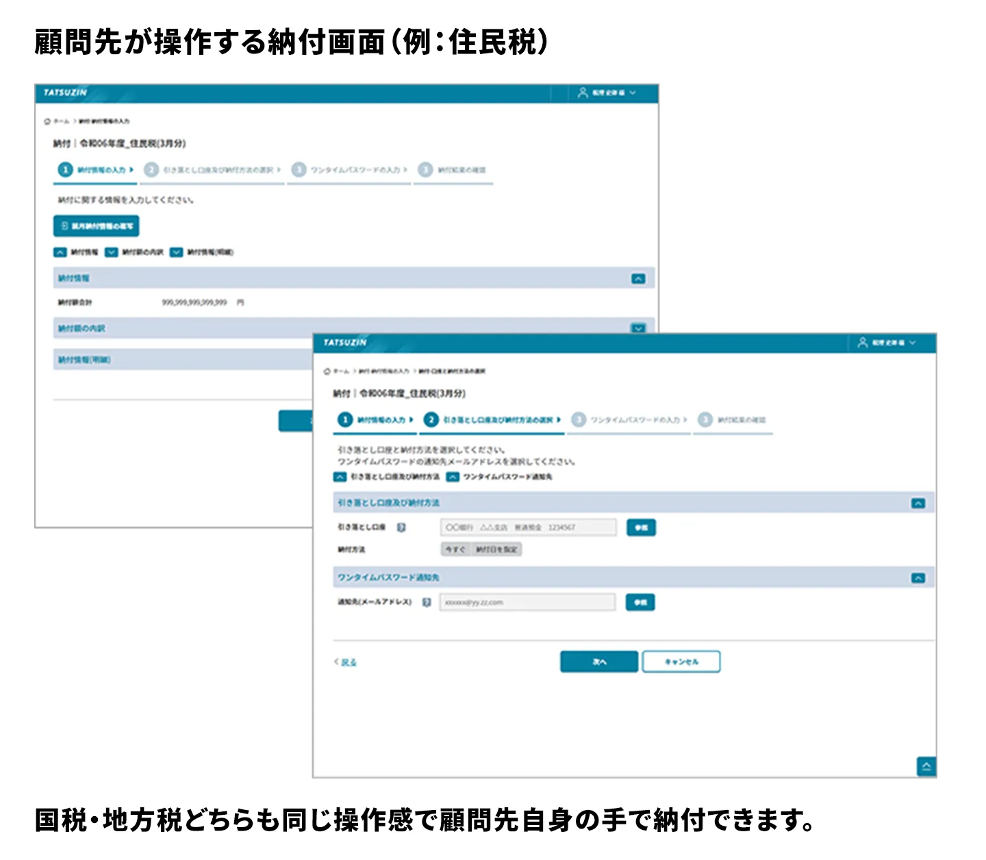 顧問先は受信した納付依頼メールから、税目や金額を確認したうえで、そのまま国税・地方税のダイレクト納付を行うことができます。e-Tax、eLTAXのIDやパスワードによる認証はシステムが裏で実行するため、直感的かつシンプルで分かりやすい操作性です。