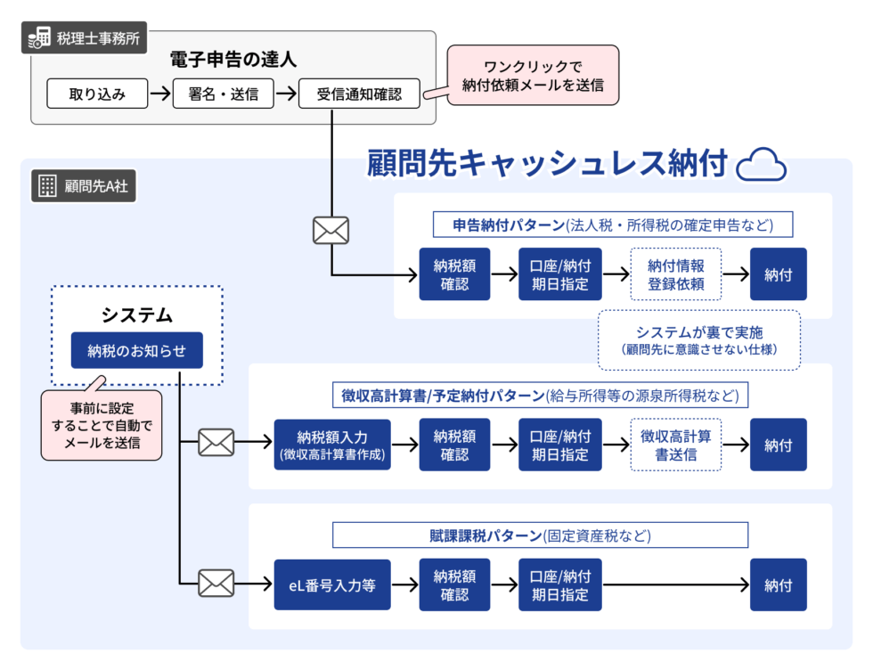 「電子申告の達人」で作成した申告データとシームレスに連携しており、税理士から申告後にワンクリックで顧問先に納付依頼メールを送信できます。申告を伴わない納付については、事前に納付有無を税理士が設定しておくことで、システムが自動で納付依頼メールを送信し、自主的な納付を促します。
