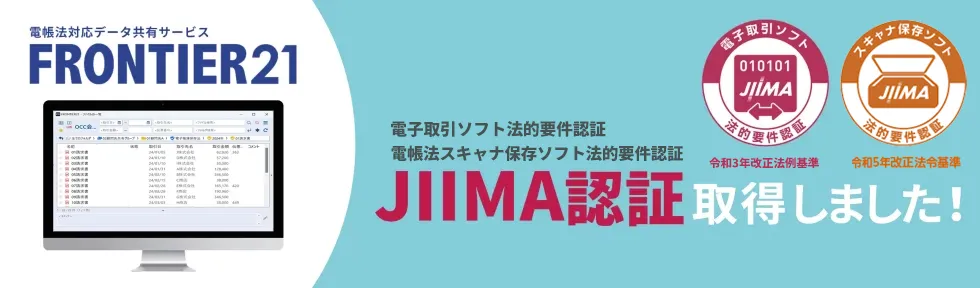 ユーザー数無制限のクラウドストレージサービスFRONTIER21は、2024年7月25日に公益社団法人日本文書情報マネジメント協会(JIIMA)の「電子取引ソフト法的要件認証」を取得しました。