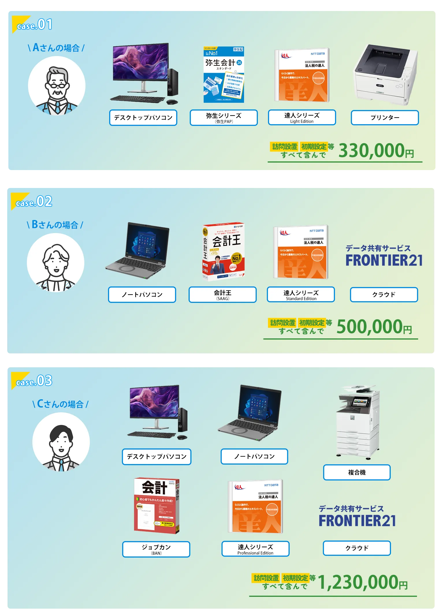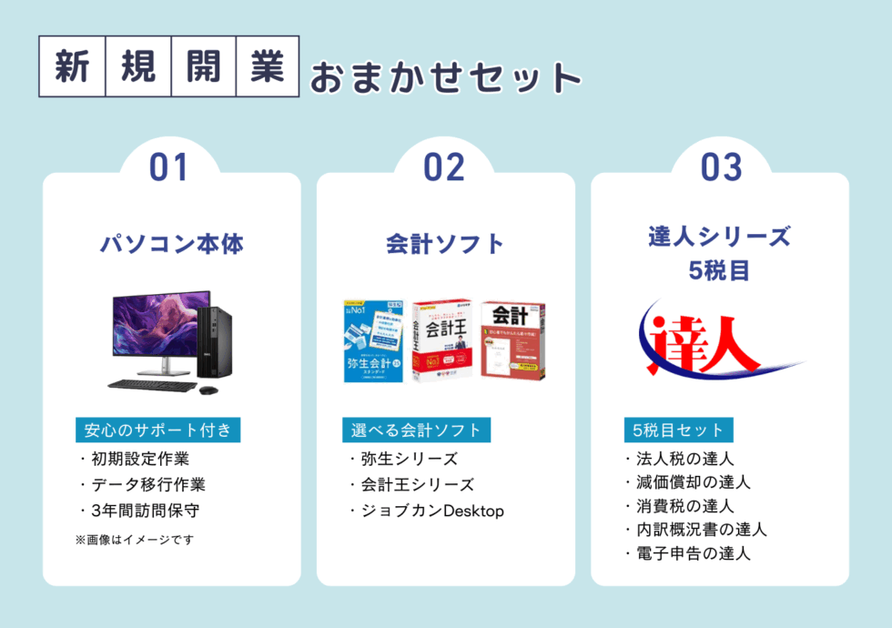 「パソコン「会計ソフト」「税務ソフト」すべて含んで26万円(税抜)〜