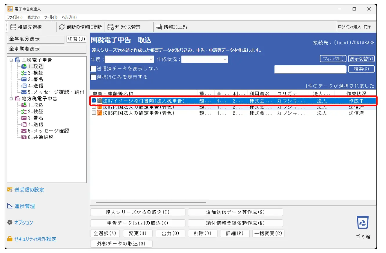 8.一覧上に[イメージ添付書類]、作成状況:[作成中]というデータが取り込まれました。[イメージ添付書類]のデータのチェックボックスにだけチェックを入れ、[2.署名]~[4.送信]を行ってください。(※送信済みの申告データは送信しません)