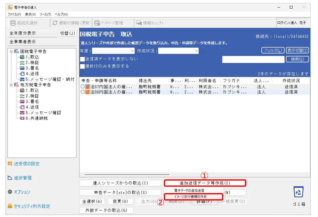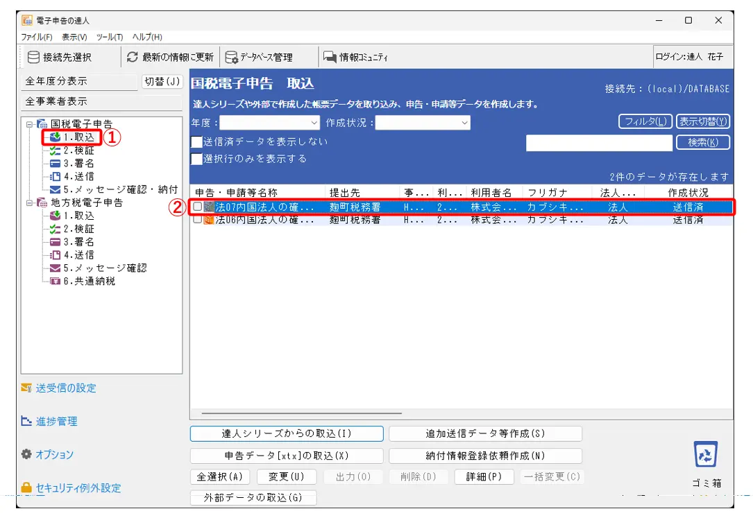1.電子申告の達人-[国税電子申告]-[1.取込]をクリックし(①)、[送信済]の電子申告データをクリックして選択します(②)。