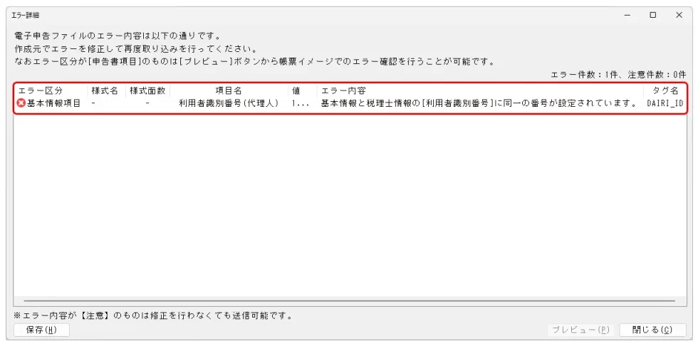 A.取込みしたデータの[基本情報]タブと[税理士情報]タブに、同じ利用者識別番号/利用者IDが設定されていると表示されるメッセージです。 税理士本人が電子申告する場合、代理送信ではないため税理士情報タブの該当欄は空欄にします