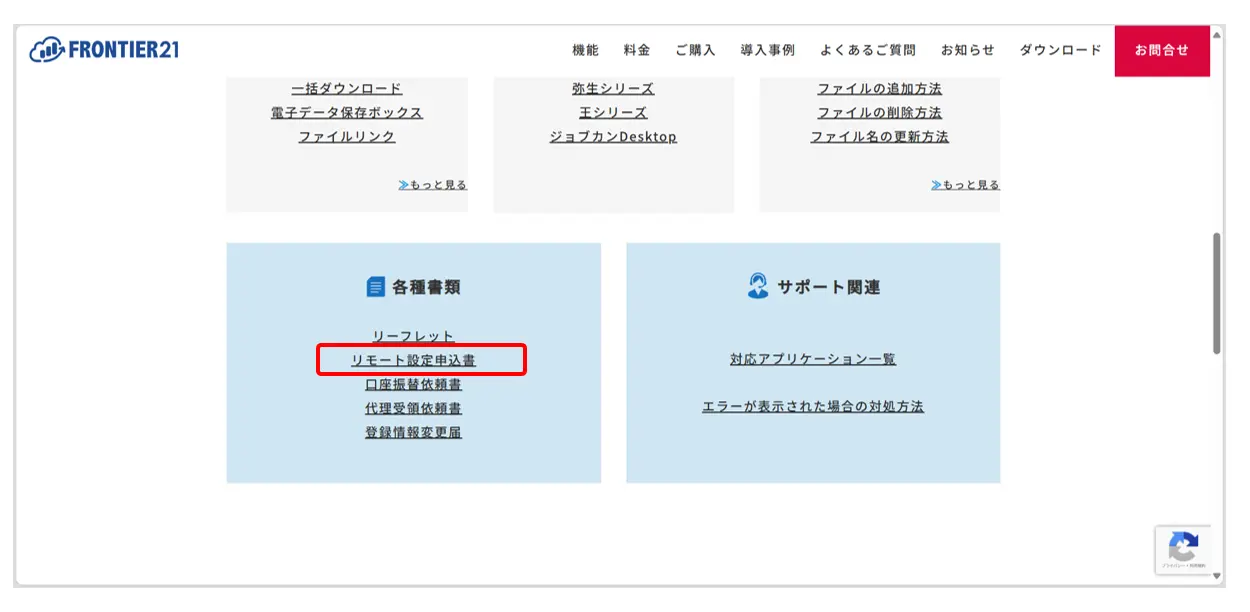 顧問先様PC等へのFRONTIER21リモート設定サービスも承っております。ヘルプ内の[各種書類]-[リモート設定申込書]をクリックし、必要事項をご記入いただきお申し込みください。