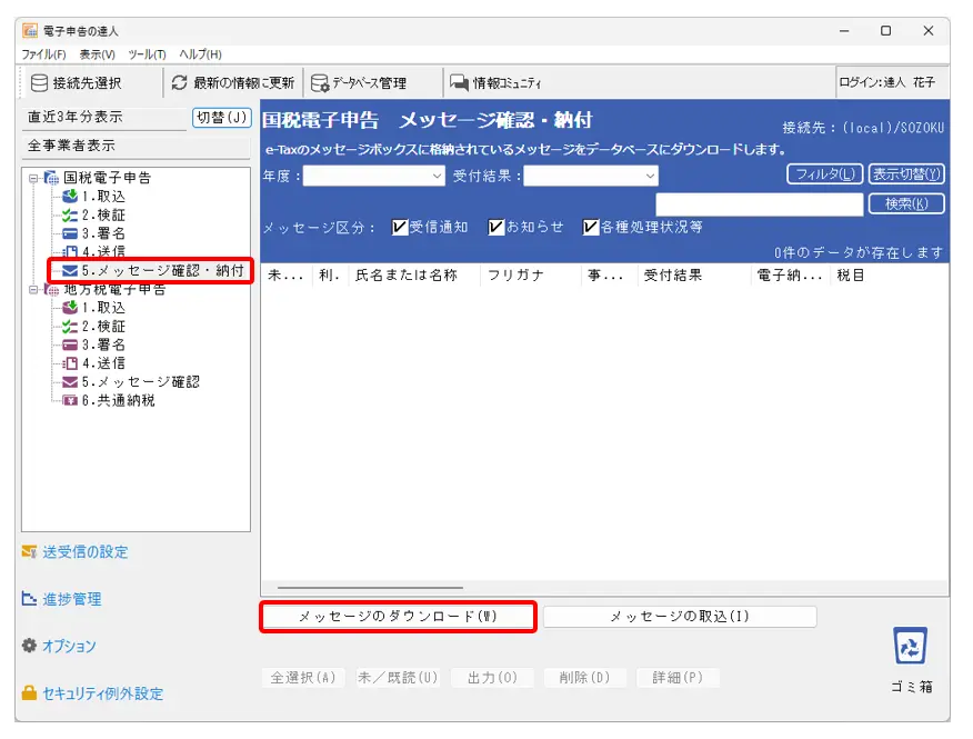 [5.メッセージ確認・納付]画面の[メッセージのダウンロード]ボタンをクリックして、税理士の利用者識別番号でメッセージをダウンロードしてください。メッセージをダウンロードする際は、税理士カードなどの電子証明書の認証が必要です。
