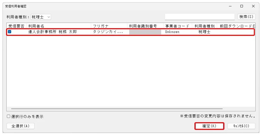2.[受信利用者確認]画面で、税理士の[受信要否]のチェックボックスにチェックを入れ、メッセージをダウンロードします。