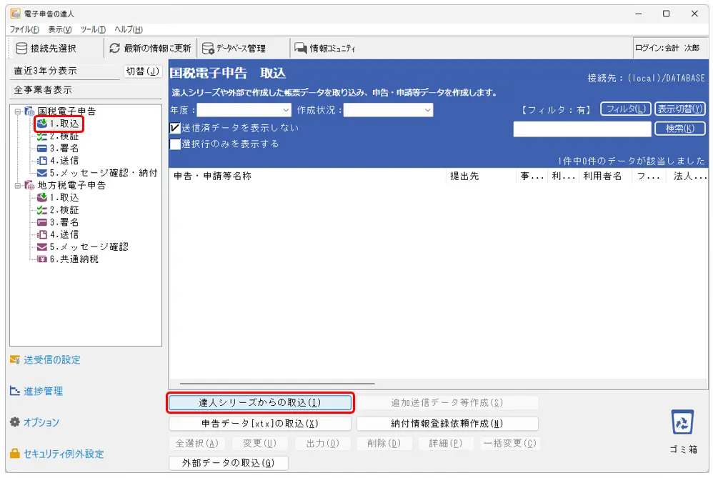 1.電子申告の達人を起動後、国税電子申告-[1.取込]を選択し、[達人シリーズからの取込]をクリックします。