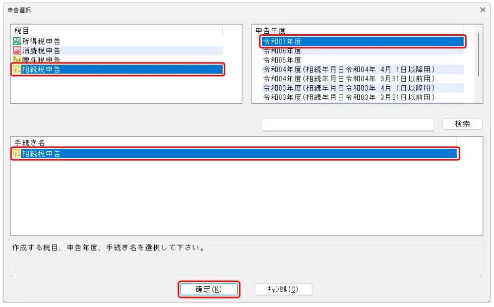 3.[税目:相続税申告][申請等年度][手続き名:相続税申告]を選択し、[確定]をクリックします。