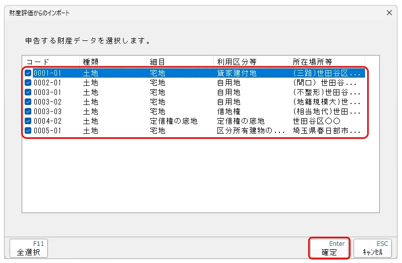 11.申告する財産データにチェックを入れ、[確定]をクリックします。