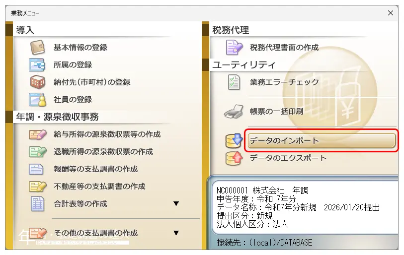 1.年調・法定調書の達人のデータを開き、業務メニュー[データのインポート]をクリックします。