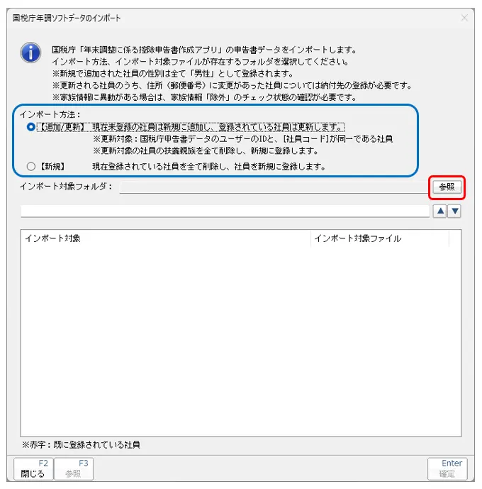 3.[国税庁年調ソフトデータのインポート]画面が表示されましたら、[インポート方法]を選択し、[インポート対象フォルダ]の[参照]をクリックします。