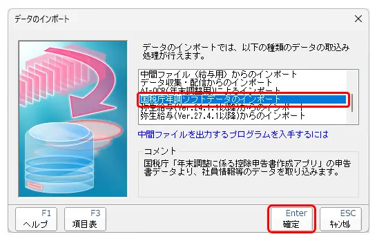 2.[データのインポート]画面が表示されましたら、[国税庁年調ソフトデータのインポート]を選択し、[確定]をクリックします。