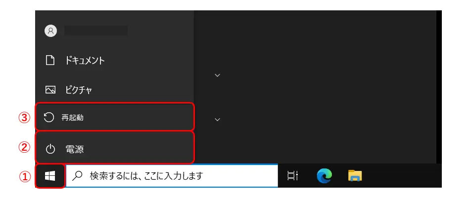 [リモートデスクトップ接続]上のWindowsのスタートボタンをクリックします(①)。[電源]をクリックし(②)、[再起動]をクリックします(③)。