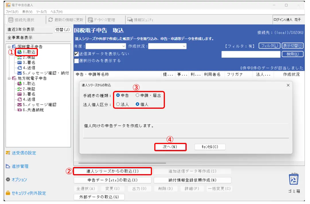 1.電子申告の達人を開きます。[国税電子申告]-[1.取込]をクリックし(①)、[達人シリーズからの取込]をクリックします(②)。[手続きの種類:申告][法人個人区分:個人]を選択し(③)、[次へ]をクリックします(④)。