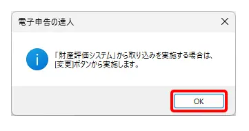 1.下記のメッセージが出ますので、そのまま[財産評価の達人]からのデータのインポートが可能です。[はい]をクリックします。