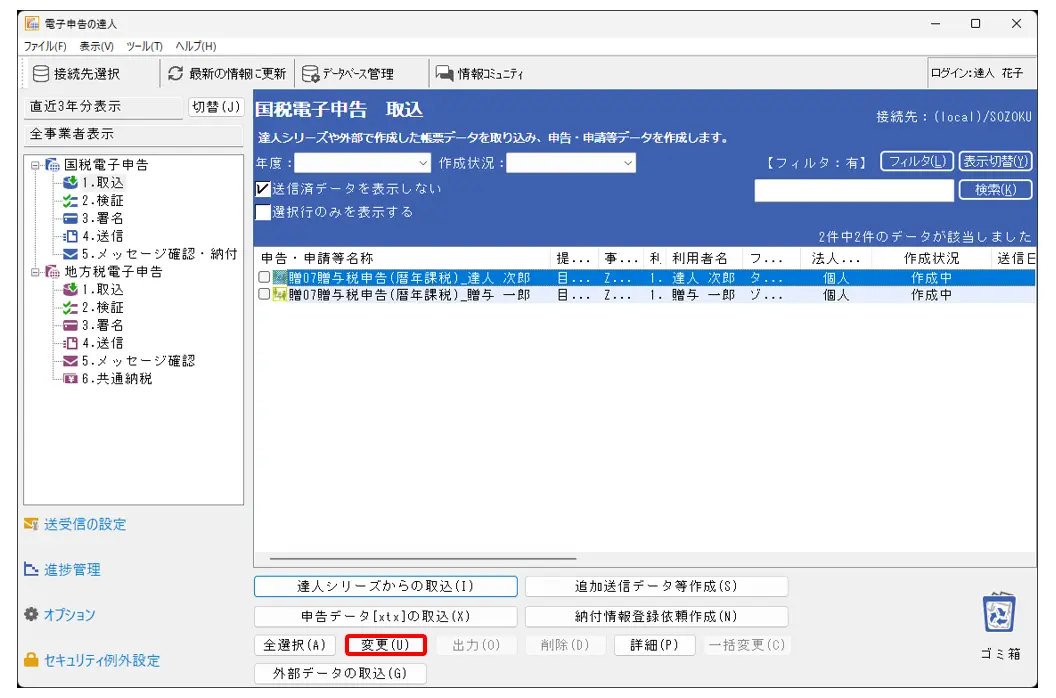 2.[1.取込]画面に複数件の贈与税の申告データが取り込まれます。1件ずつデータをクリックして選択し、[変更]をクリックします。