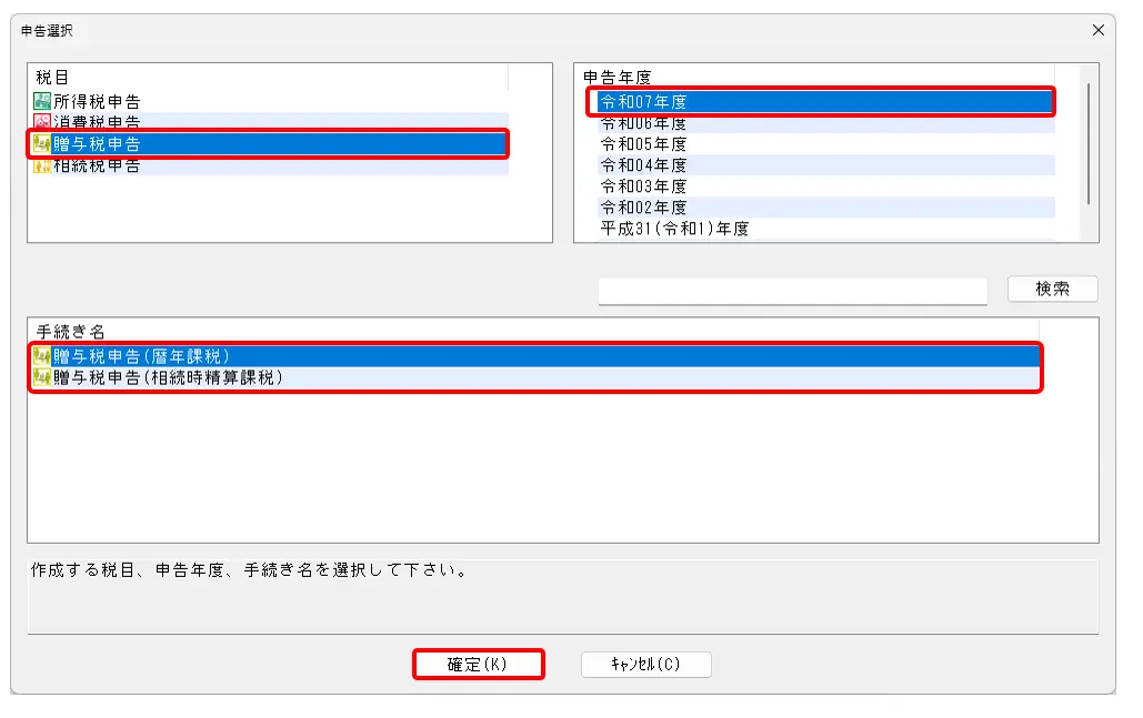 2.申告選択画面で、[税目:贈与税申告]をクリックし、[申告年度:令和××年度(※申告年度)]をクリックし、[手続き名:贈与税申告(暦年課税もしくは相続時精算課税)]を選択します。[確定]をクリックします。