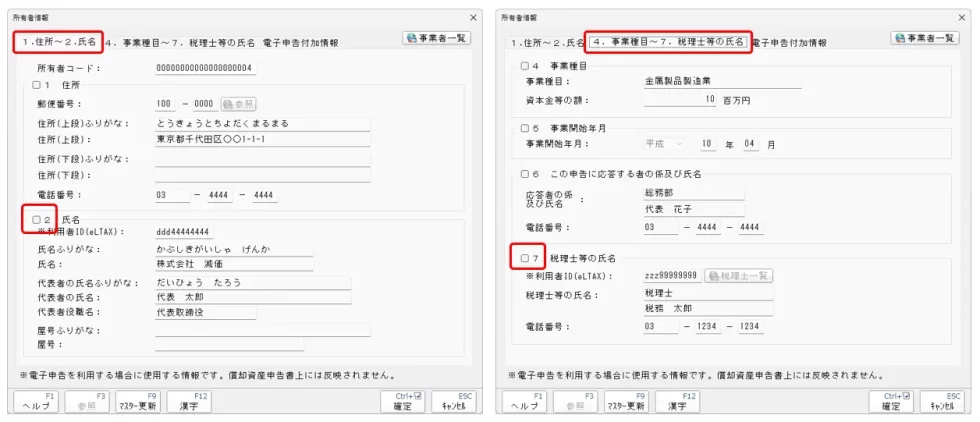 3.[1.住所~2.氏名]タブ-[2 氏名]に上書き入力のチェックが入っている場合は、外していただくと、基本情報から連動します。(税理士の利用者IDは、[4.事業種目~7.税理士等の氏名]タブ-[7.税理士等の氏名]を確認してください。)