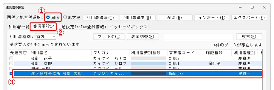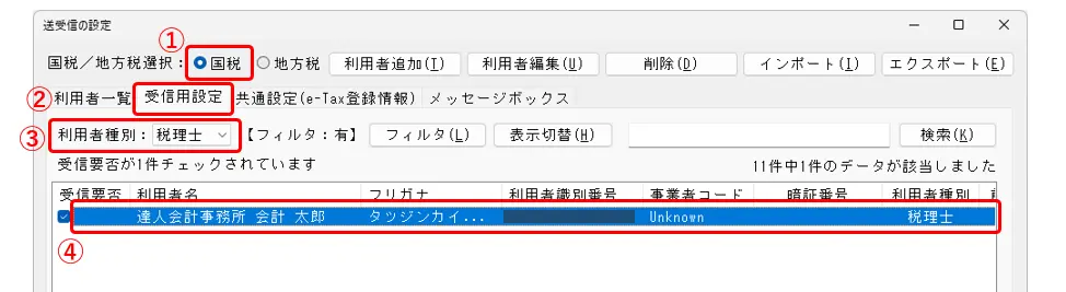 11.[国税]にチェックを入れ(①)、[受信用設定]タブをクリックします(②)。[利用者種別:税理士]を選択し(③)、税理士の利用者名をダブルクリックします(④)。