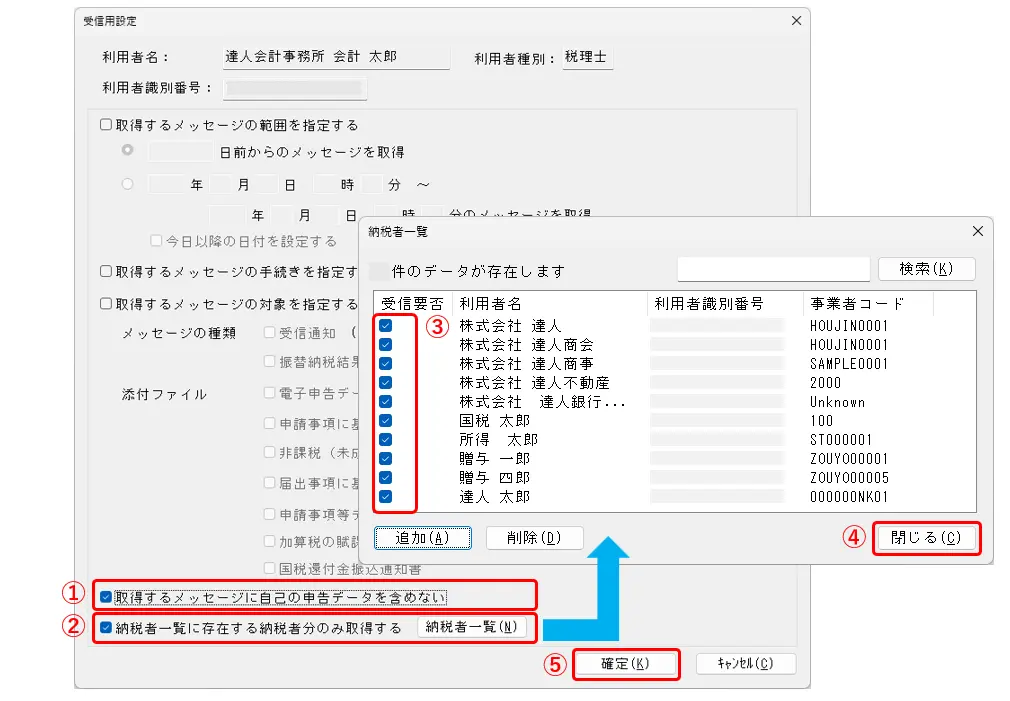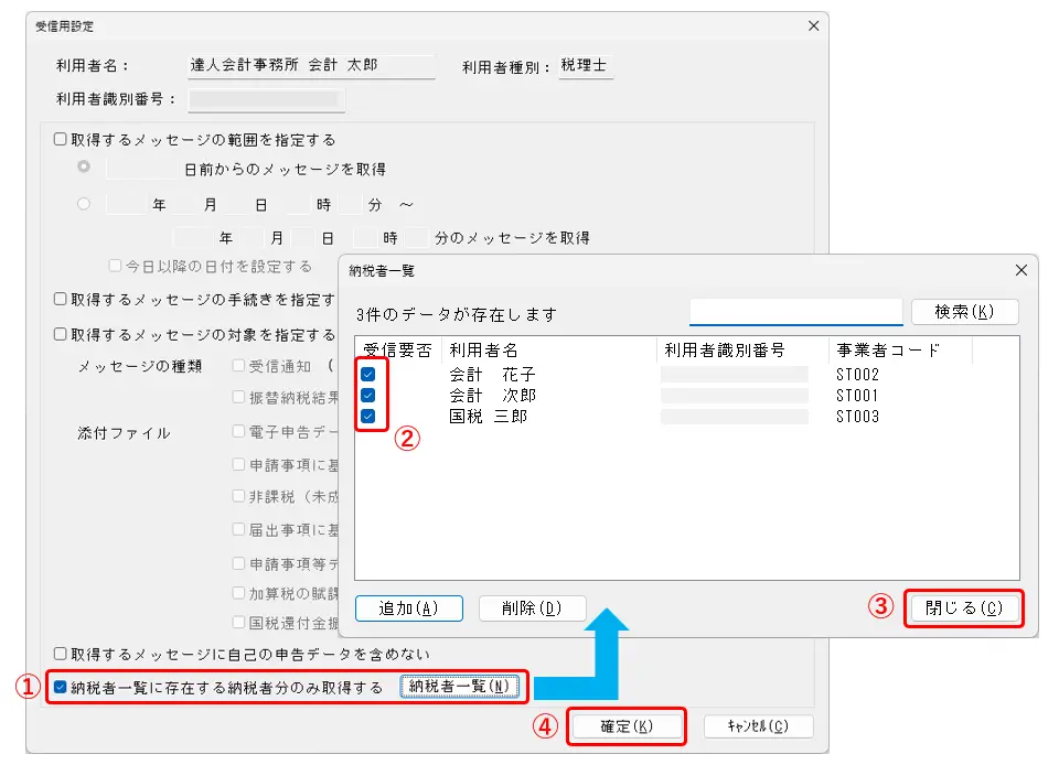 次に、[納税者一覧に存在する納税者分のみ取得する]のチェックを入れ、[納税者一覧]をクリックします(②)。納税者一覧画面が開きましたら、税理士の代理送信で送信している納税者の一覧が表示されますので、共有のデータベースで申告しない納税者に関しては[受信要否]のチェックを外し(③)、[閉じる]をクリックします(④)。※ここでチェックを入れた納税者に関しての[受付完了通知]や[お知らせ]がダウンロードできます。