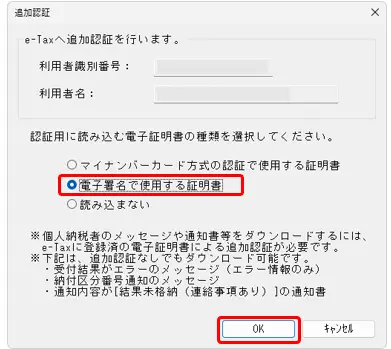 4.[追加認証]画面が表示されましたら、認証用に読み込む電子証明書の種類を選択し、[OK]をクリックします。[認証]画面が表示されましたら、税理士の電子証明書で認証を行います。