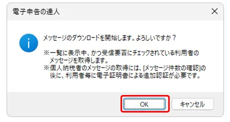 ※メッセージが重複してダウンロードされるのを防ぐため、[送受信の設定]-[受信用設定]タブから納税者の名前をダブルクリックし、取得するメッセージの範囲を絞ってからダウンロードされることをお勧めいたします。