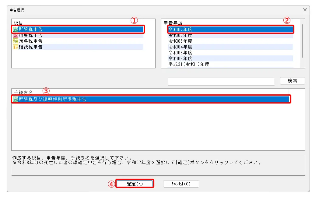 4.申告選択画面で[税目:所得税申告](①)、[申告年度:令和07年度](②)、[手続き名:所得税及び復興特別所得税申告]を選択し(③)、確定をクリックします(④)。