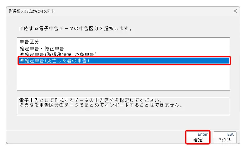 5.[準確定申告(死亡した者の申告)]を選択し、[確定]をクリックします。