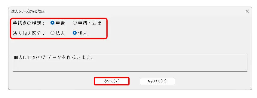 3.[手続きの種類:申告]、[法人個人区分:個人]にチェックを入れて、[次へ]をクリックします。