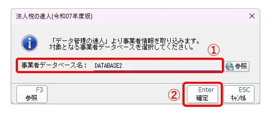 2.対象の事業者データベース名を選択し(①)、[確定]をクリックします(②)。