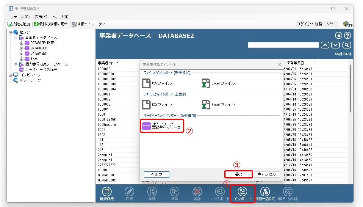 1.データ管理の達人-[事業者データベース]-[対象のデータベース]を開き、[インポート]をクリックします(①)。[事業者情報のインポート]画面が表示されましたら[達人シリーズ業務データベース]をクリックし(②)、[選択]をクリックします(③)。