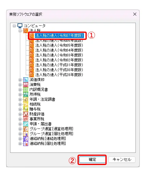 2.[業務ソフトウェアの選択]画面で、基本情報をインポートする達人シリーズを選択し(①)、[確定]をクリックします(②)。