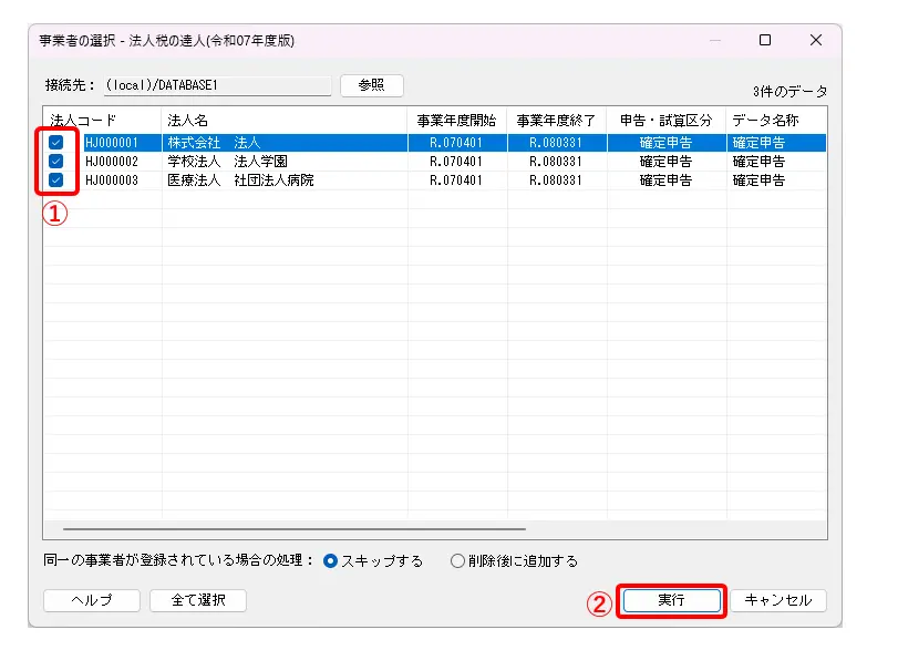 3.対象の事業者のチェックボックスにチェックを入れ(①)、[実行]をクリックします(②)。