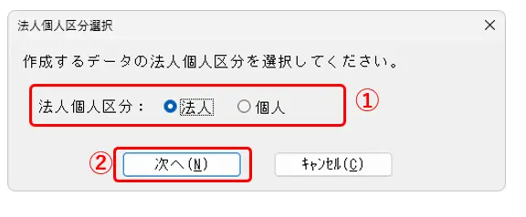 2.[法人個人区分選択]画面が表示されますので、選択し(①)、[次へ]をクリックします(②)。