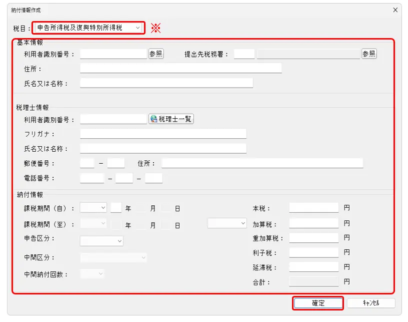 7.個人の場合は、税目を選択し(※)、納付情報を手入力します。[確定]をクリックします。