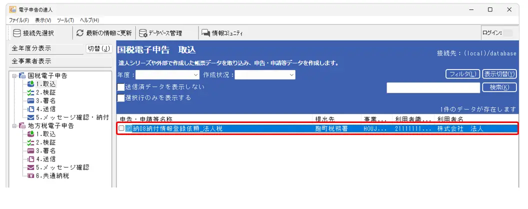 1.電子申告の達人を開きます。[国税電子申告]-[1.取込]をクリックし(①)、[納付情報登録依頼作成]をクリックします(②)。