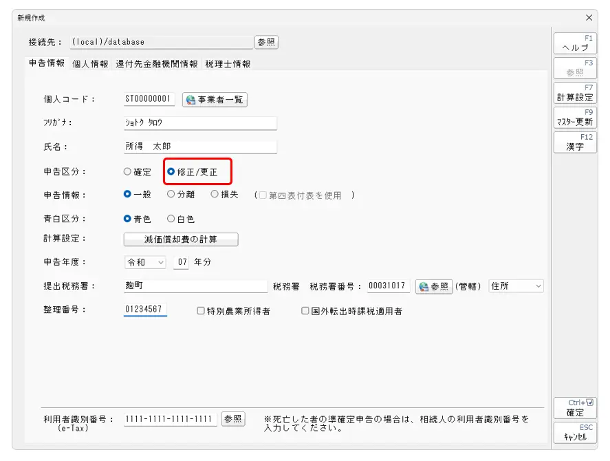 2.申告区分:[修正/更正]を選択し、データを作成します。