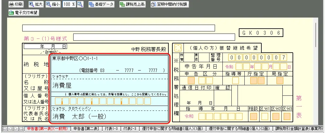 1.申告書第一表の左上、住所などの欄をダブルクリックします。
