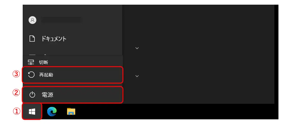[クラウドデスクトップ接続]上のWindowsのスタートボタンをクリックします(①)。[電源]をクリックし(②)、[再起動]をクリックします(③)。