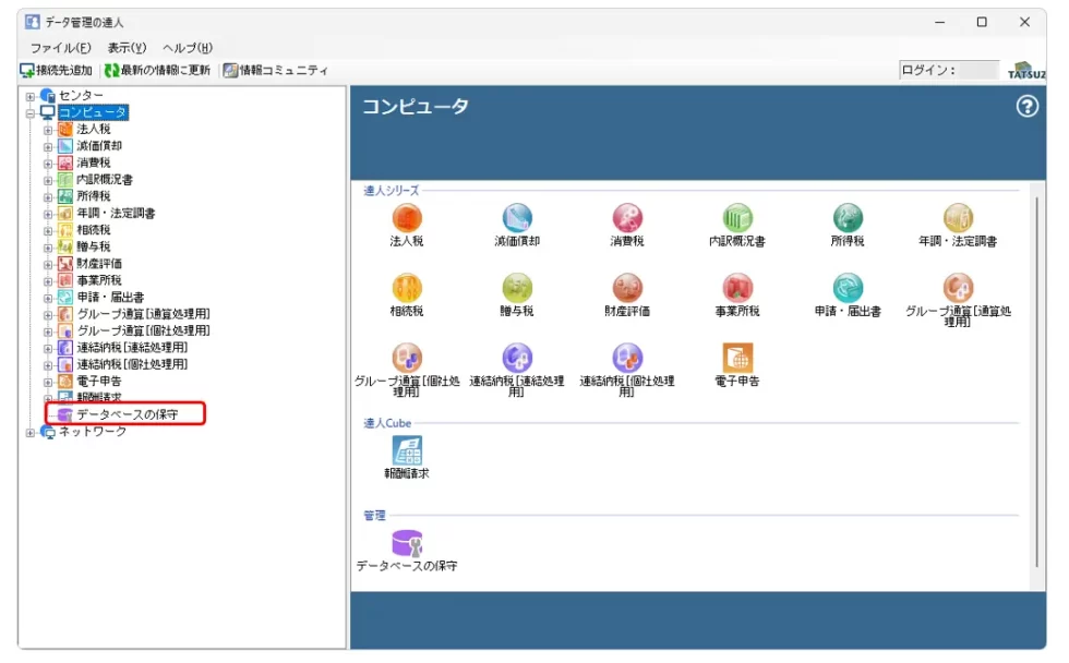 2.[コンピュータ]-[データベースの保守]をクリックします。
