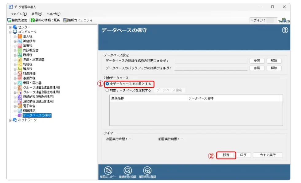 3.[データベースの保守]画面が表示されます。[全データベースを対象とする]を選択し(①)、[設定]ボタンをクリックします(②)。
