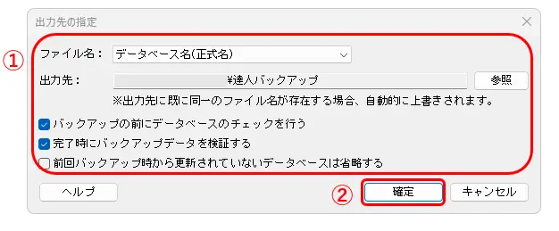 ・【データベース名(正式名)+日付】にすると、日付ごとにバックアップが取られます。