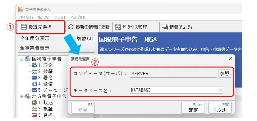 [接続先選択]をクリックし(①)、接続先とデータベース名を指定し(②)、[確定]します。
