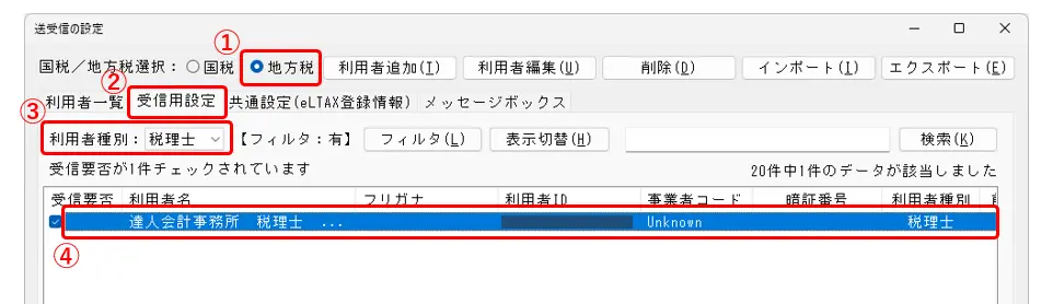 11.[地方税]にチェックを入れ(①)、[受信用設定]タブをクリックします(②)。利用者種別:[税理士]を選択し(③)、税理士の利用者名をダブルクリックします(④)。