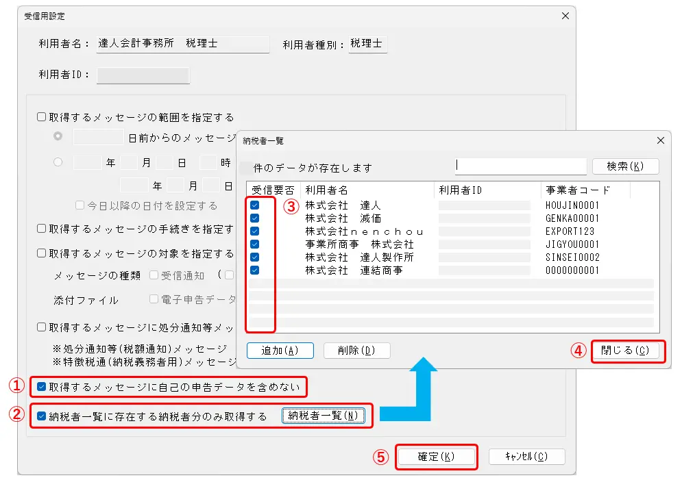 次に、[納税者一覧に存在する納税者分のみ取得する]のチェックを入れ、[納税者一覧]をクリックします(②)。納税者一覧画面が開きましたら、税理士の代理送信で送信している納税者の一覧が表示されますので、共有のデータベースで申告しない納税者に関しては[受信要否]のチェックを外し(③)、[閉じる]をクリックします(④)。※ここでチェックを入れた納税者に関しての[受付完了通知]や[お知らせ]がダウンロードできます。