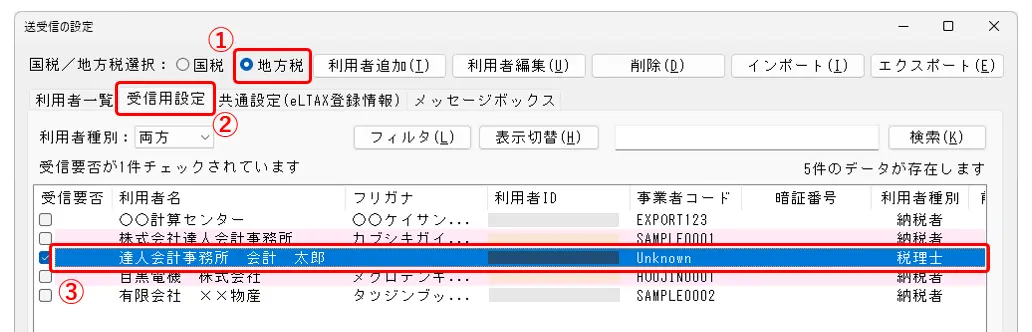 15.[地方税]にチェックを入れ(①)、[受信用設定]タブをクリックします(②)。税理士の利用者名をダブルクリックします(③)。