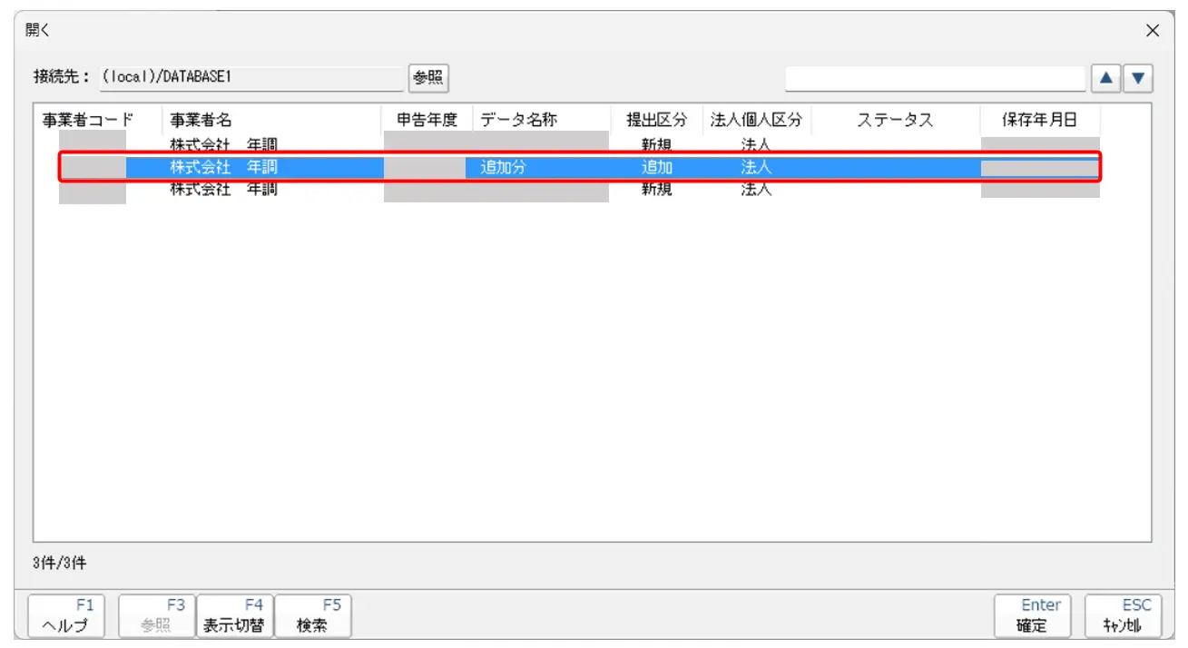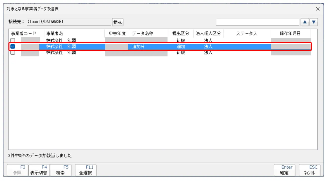 3.画面に沿って進みます。[対象となる顧問先データの選択]で、【追加分】(※Step2で作成したデータ)のみにチェックを入れて、[確定]をクリックします。