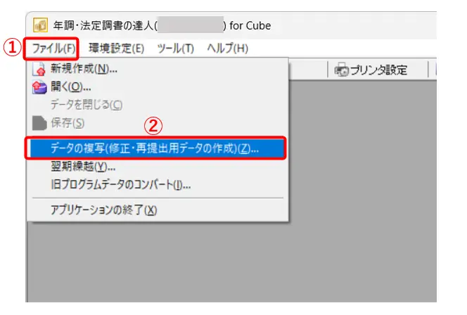4.年調・法定調書の達人を開き、メニューバーから[ファイル]-[データの複写(修正・再提出用のデータの作成)]の順に選択します。