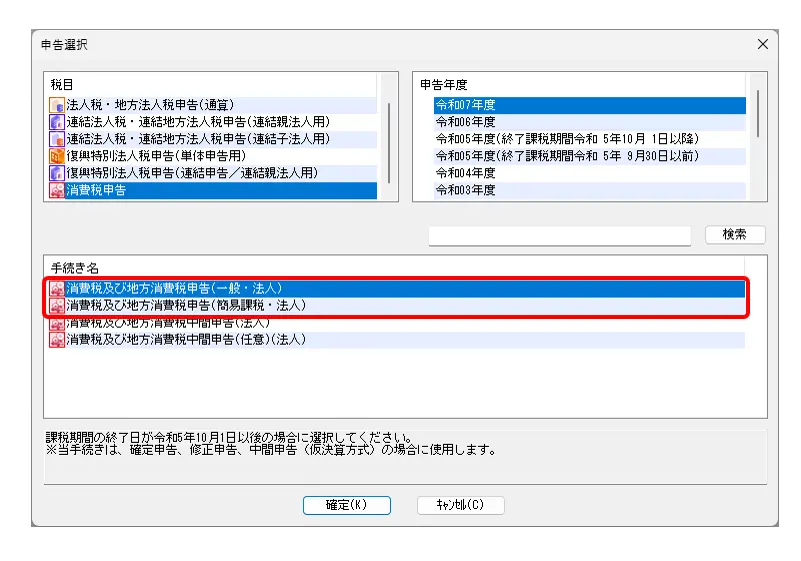 ※[課税区分:簡易課税]の方は[消費税及び地方消費税申告(簡易課税・法人)又は(簡易課税・個人)]に設定します。
