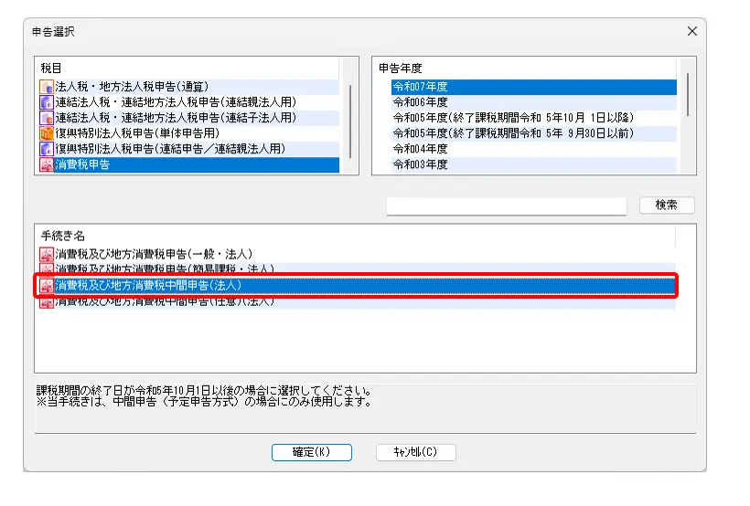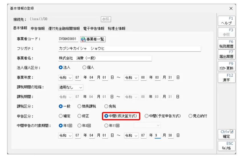 ■「消費税の達人」業務メニューの[基本情報の登録]で申告区分:中間申告(仮決算方式)を選択している場合